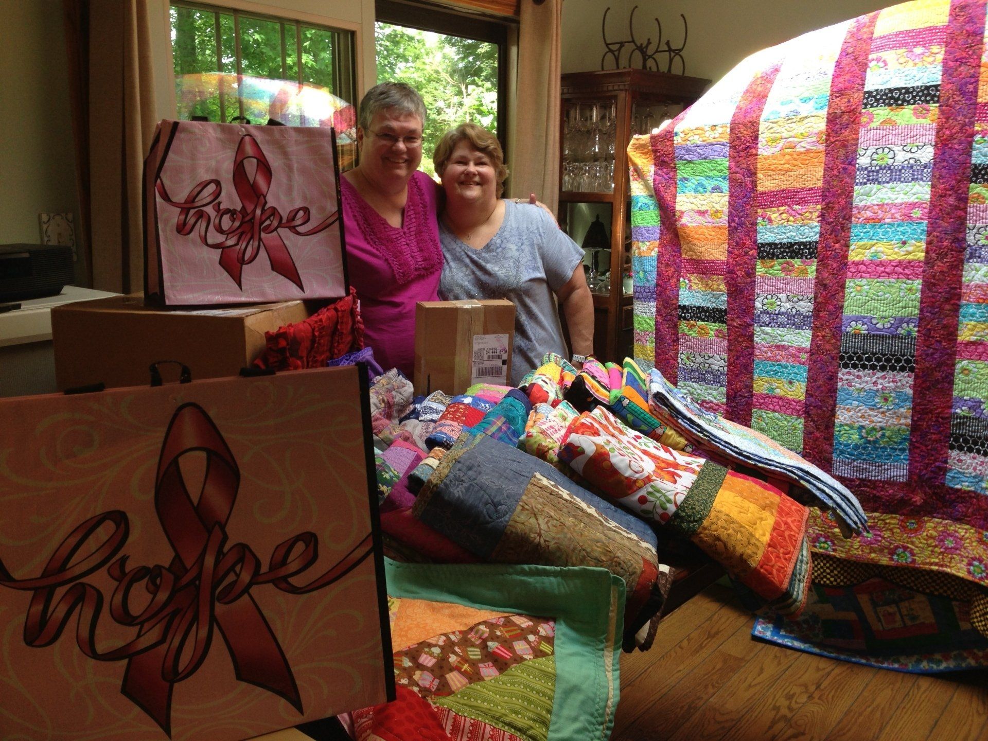 Sue and Kathy packaging the 400 comfort quilts made by quilters from the United States, England and Switzerland to be hand delivered to the mothers who lost a child, teachers who saved the students, and those who lost a home in Moore, Oklahoma due to the worst tornado in history.